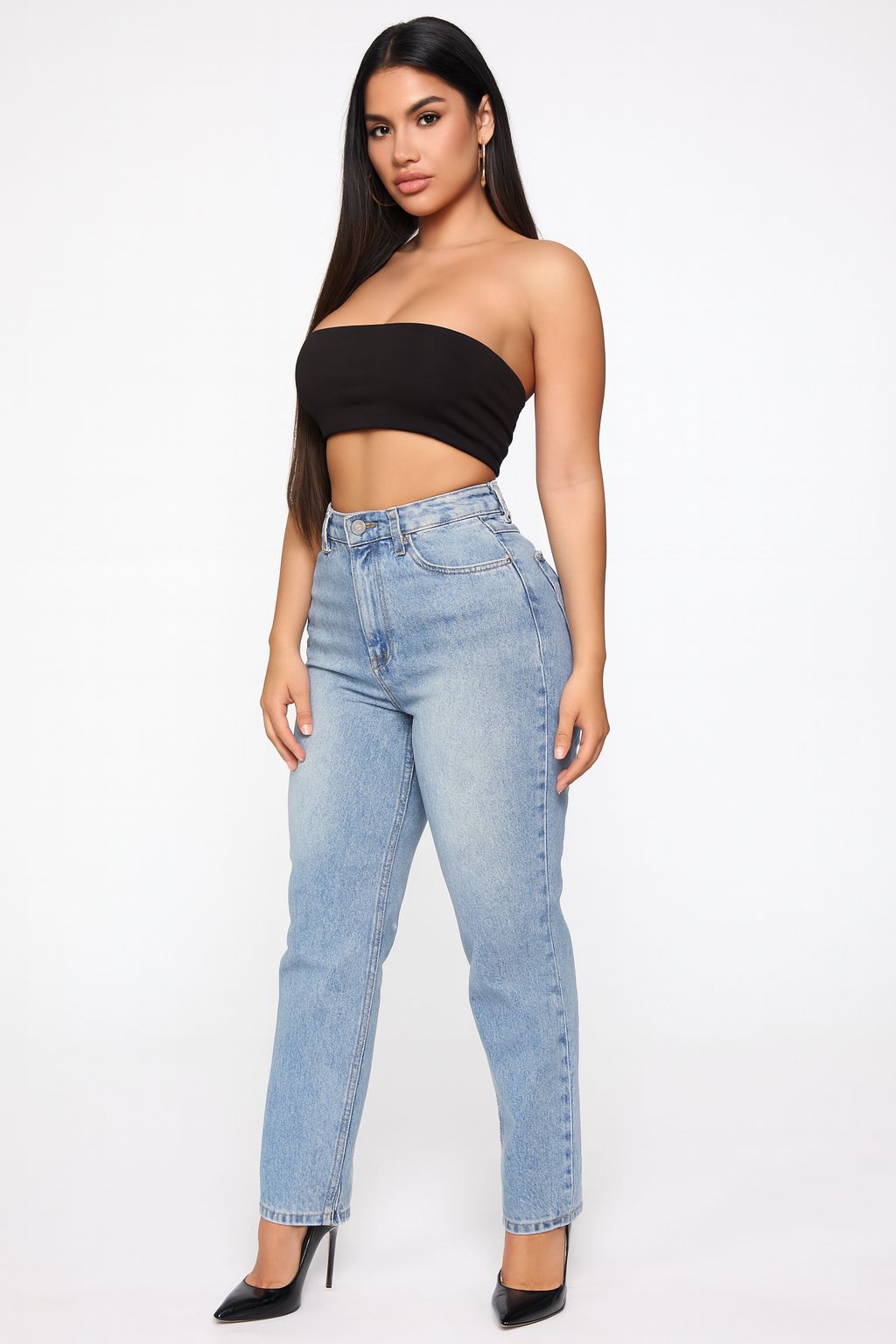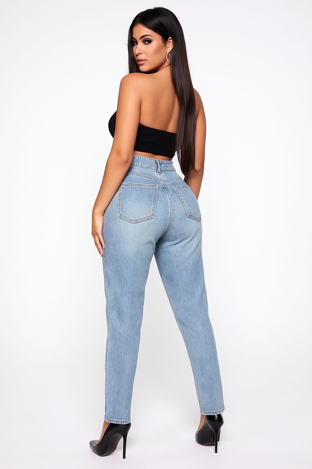 Pantalón Momfit tiro alto, cinco bolsillos . Lavado Celeste Stone + Localizado + Nevado. Rígido
